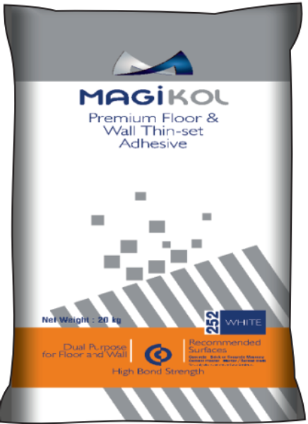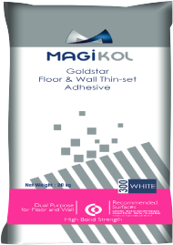 290 GreyMagikol Premium thin set adhesive is a multi- purpose, polymer modified thin set powder offering vast utility including applications on interior floor & wall as well as limited exterior floor & wall installations. It is a cementitious thin set powder to be mixed only with water to install various types of tiles & stone on variety of substrates using thin set method of installation.